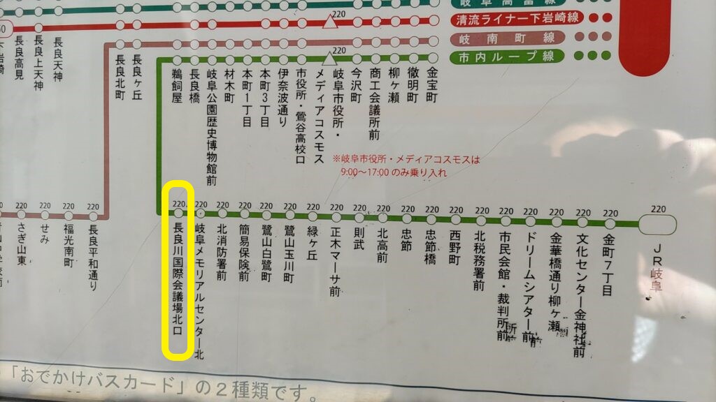 岐阜バスの路線図です。「岐阜メモリアルセンター」の隣りが「長良川国際会議場」のバス停です。