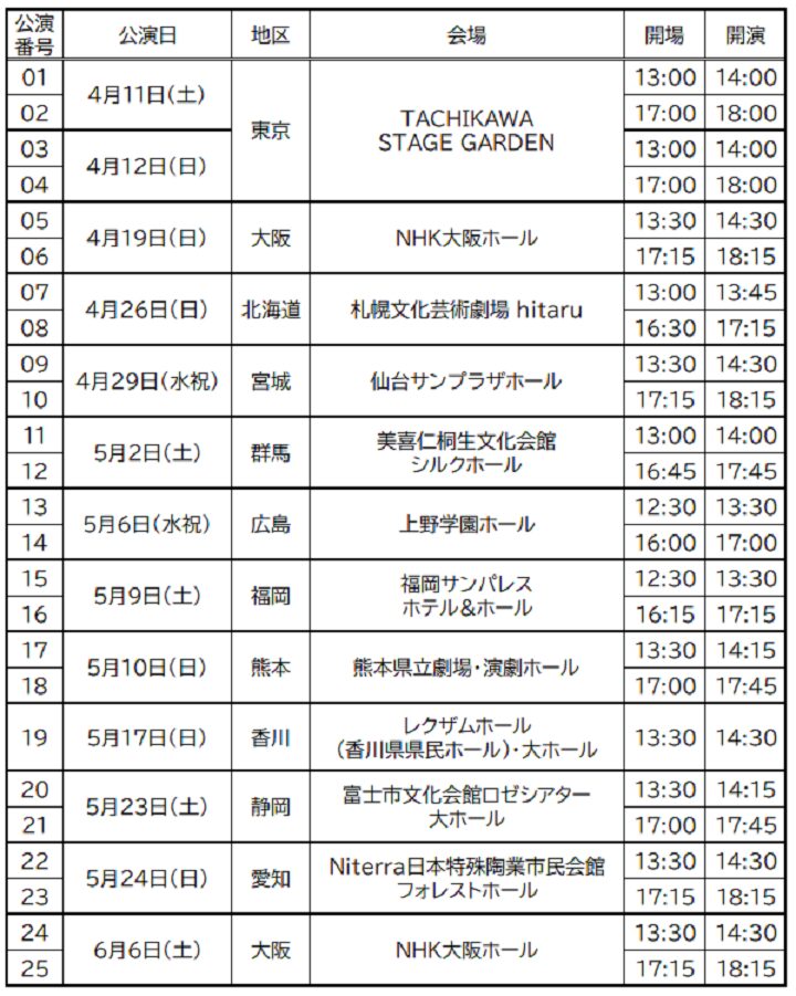初日はいつもより約1か月遅い4月11日(土)に定番会場である「TACHIKAWA STAGE GARDEN」で開催。1週目の土日をが東京(立川)、2週目に大阪公演を行った後は、合計で全国11都市・25公演を回ります。今回の四国公演は、香川県の高松公演が組まれました。ひとまずの千秋楽は6月6日(土)の大阪公演となる見込みです。