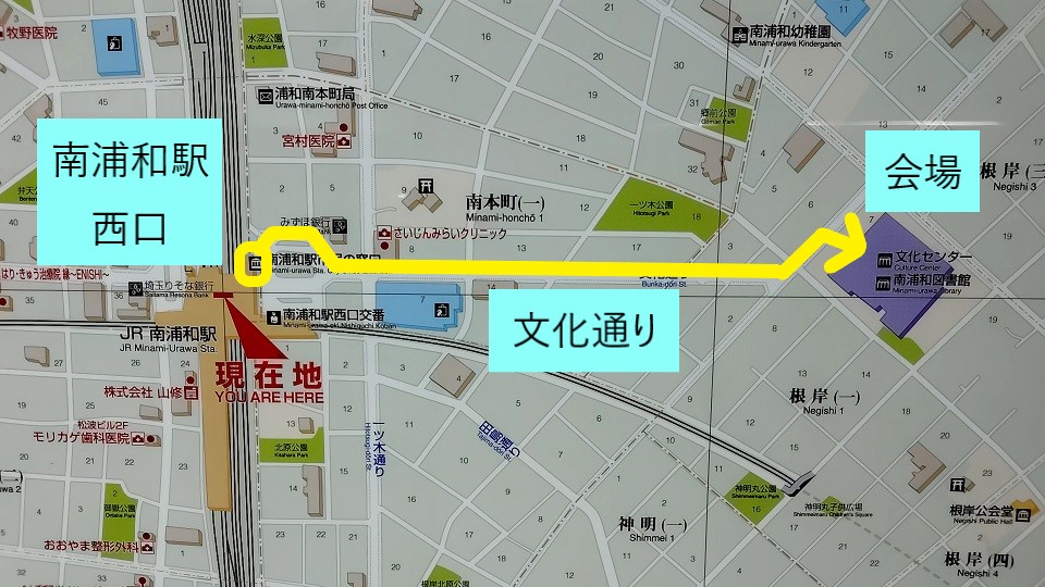続いて、JR南浦和駅から会場までの徒歩ルートの紹介です。下車後、駅西口から文化通りをほぼ直進すればOKなので、わかりやすいです。会場までの所要時間は約7分です。