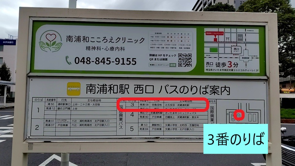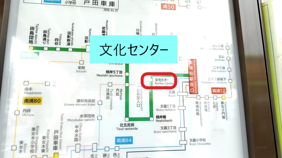 南浦和駅前からは、西口バスロータリから路線バスも出ています。国際興業バスの運行で、目的地の最寄りの「文化センター」バス停を通るバスは、3番のりばから発車します。会場までは徒歩ルートと同じく、文化通りを直進していきます。