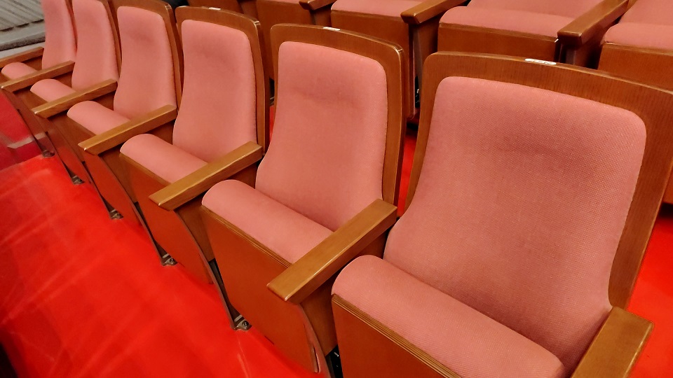 大ホールの座席はピンク色の座面・背もたれと木製の基礎の組合せです。座面のクッションはやや厚め、1階席の背もたれは中央部分がややくぼんだ形で、座り心地は上々でした。