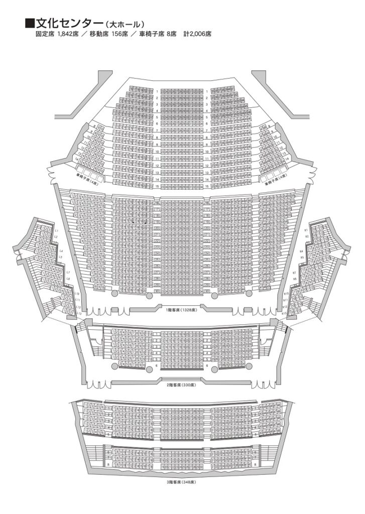 大ホールには「さくら草ホール」という愛称が付けられています。総客席数は2,006席で、1階席から3階席までの三層構造です。