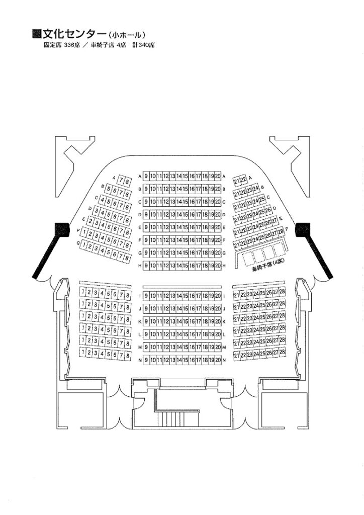 座席はA列を先頭にN列までの14列あり、途中H列(8列目)とI列(9列目)の間に中央通路が設置されています。