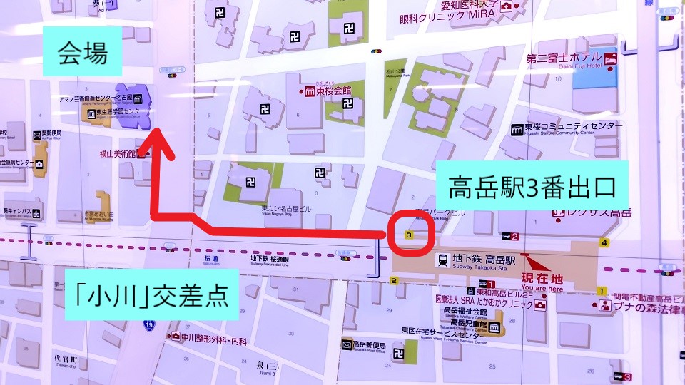 高岳駅に到着後、最寄りの3番出口から会場までの徒歩ルートを紹介します。地下鉄の線名にもなっている桜通沿いに歩き、「小川」交差点を右に曲がるルートで、会場までの所要時間は約5分です。