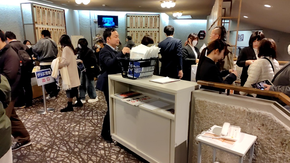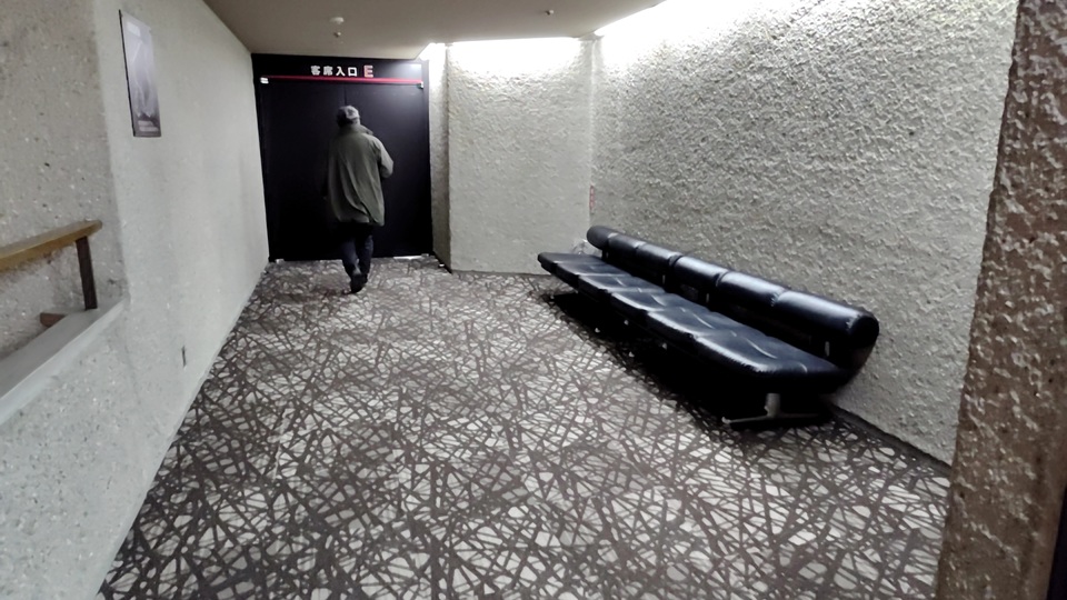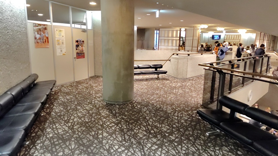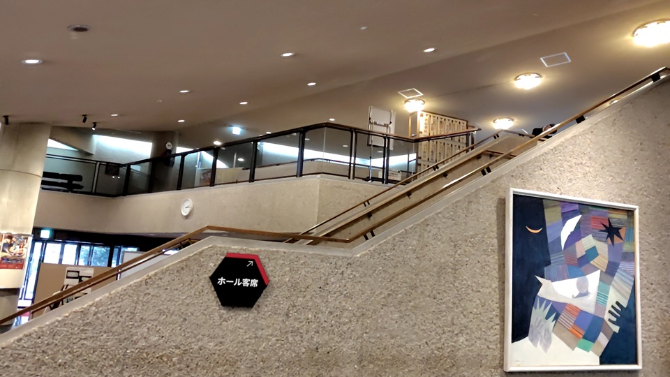 エントランスは建物2階にあり、階段を上がった所でチケットチェックが行われます。通路兼ホワイエのような形で、ホールの外壁に沿って空間が設けられており、グッズ販売等もここに設置されていました。