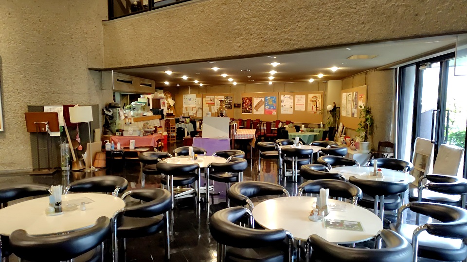 建物1階のサロンになっている場所にあるのが喫茶「リオ」です。両脇のエントランスホールから続く空間にイスとテーブルが並べられており、奥の喫茶コーナーでドリンクや軽食を注文します。