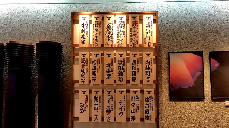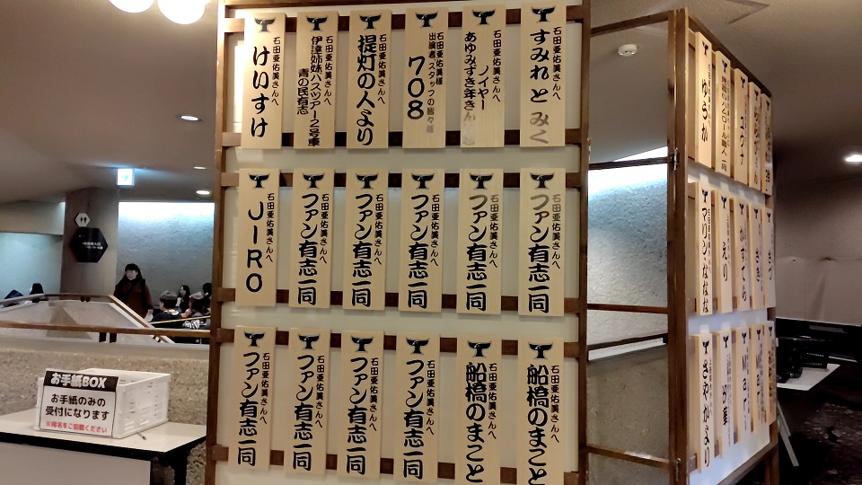 舞台などの場合、演者への祝い札がエントランスや階段の近くに飾られます。