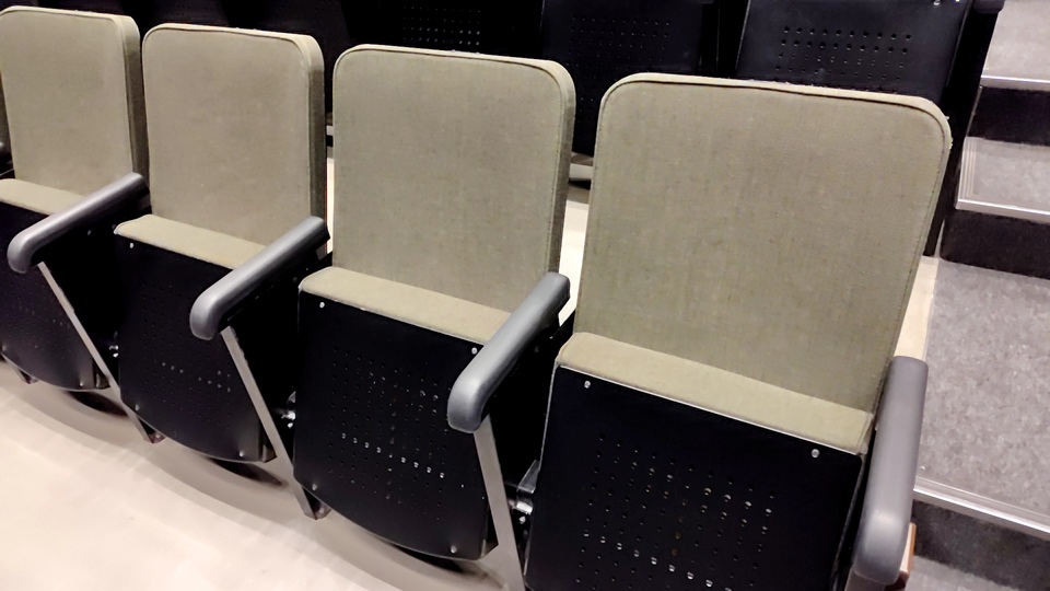 座席は薄緑色の座面・背もたれにひじ掛け・基礎の組合せです。割と古いタイプの座席という感じで、クッションは比較的固め、座席幅や前後の間隔も最近のものより比較的せまくなっていることは否定できません。2階席は1階席に比べバイバック仕様になっています。