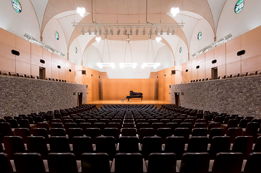 室内楽などの小編成のクラシック演奏を主目的とする音楽専用ホールですが、備付のスクリーンを利用して講演会や式典にも対応できます。教会をイメージした内装は、荘厳でロマンティックな佇まいです。