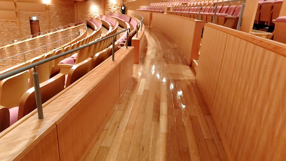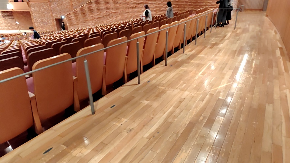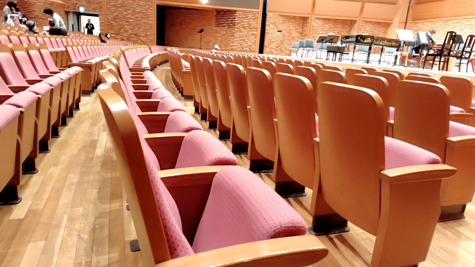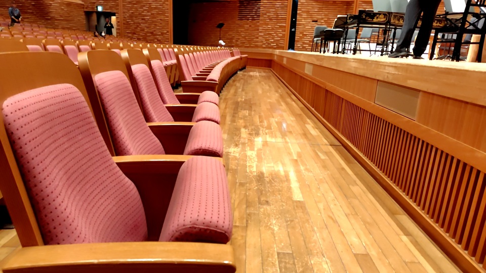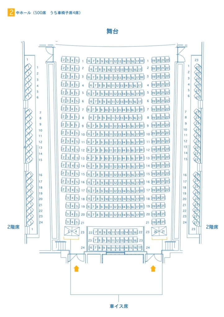 中ホールの総客席数はちょうど500席で、1階席と2階席(バルコニー席)の二層構造です。