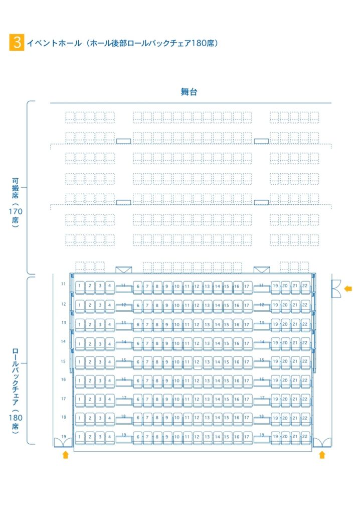 イベントホールの総客席数は350席で、ステージに近い前方に可動席170席、後方にロールバックチェア180席を配置することが可能です。