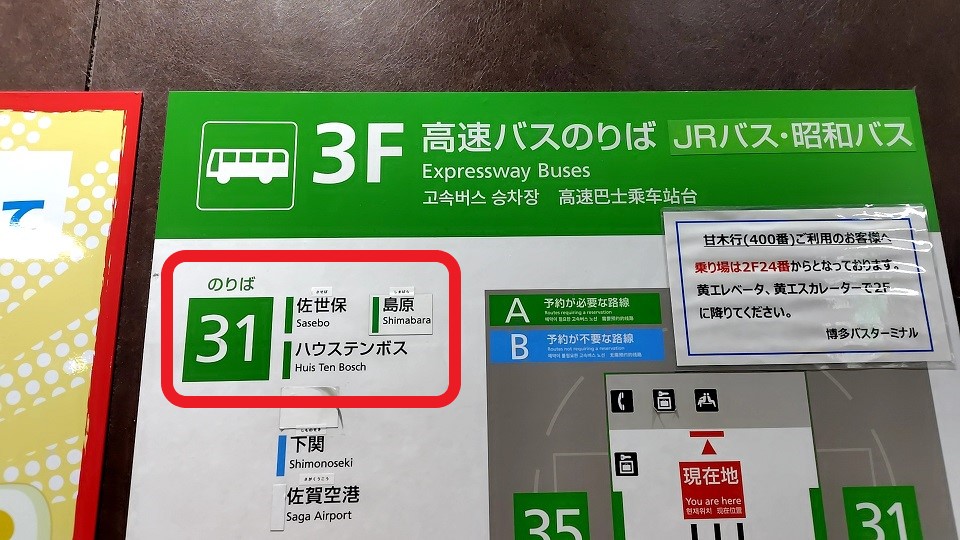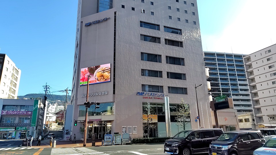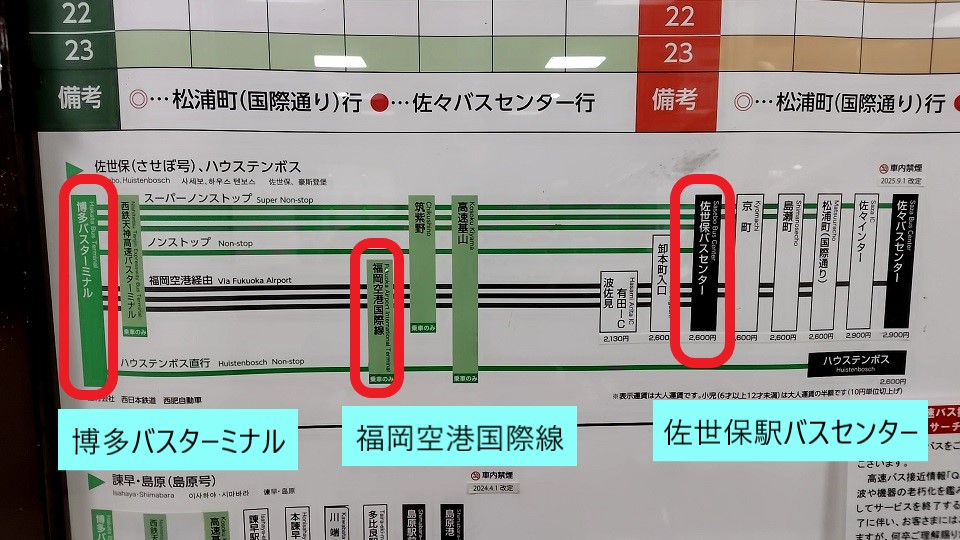 続いて、高速バス「させぼ」号を利用するルートです。佐世保行きは1日22往復で、博多駅前の「博多バスターミナル」から出ており、座席定員制(要予約)です。所要時間は約1時間50分で、運賃は片道2,600円(往復5,000円)です(2025年11月現在・WEB割引あり)。