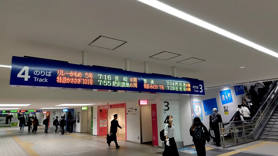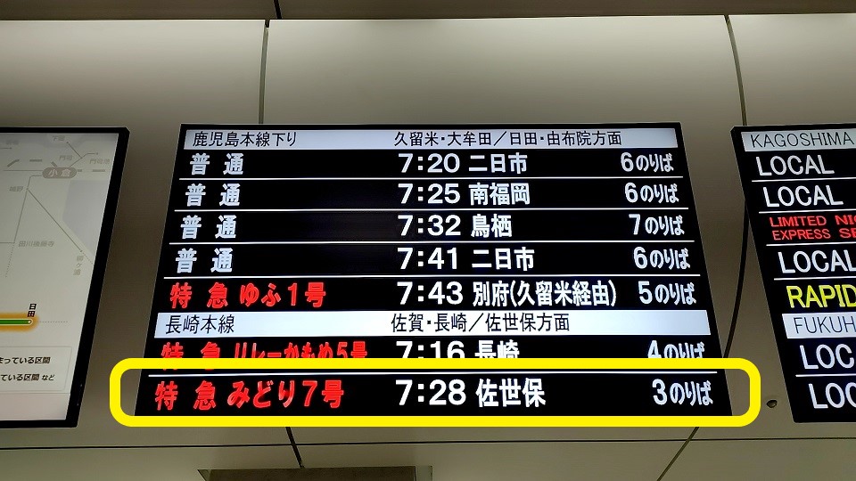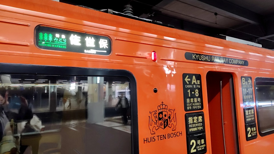 まずは新幹線等で福岡県の博多駅まで来た後、JR在来線に乗り換えるルートの紹介です。佐世保駅までは特急「みどり」号が直通で出ており、乗り換えなしで到着します。