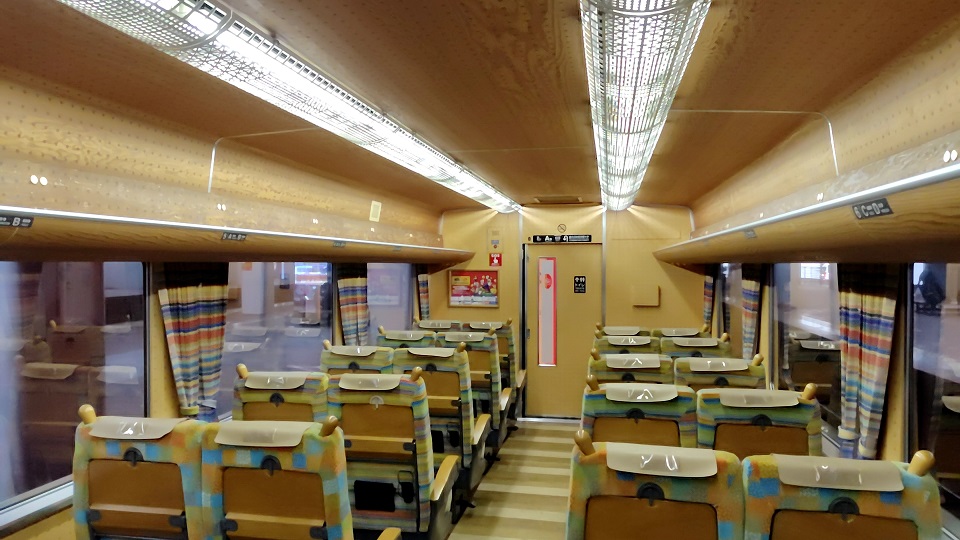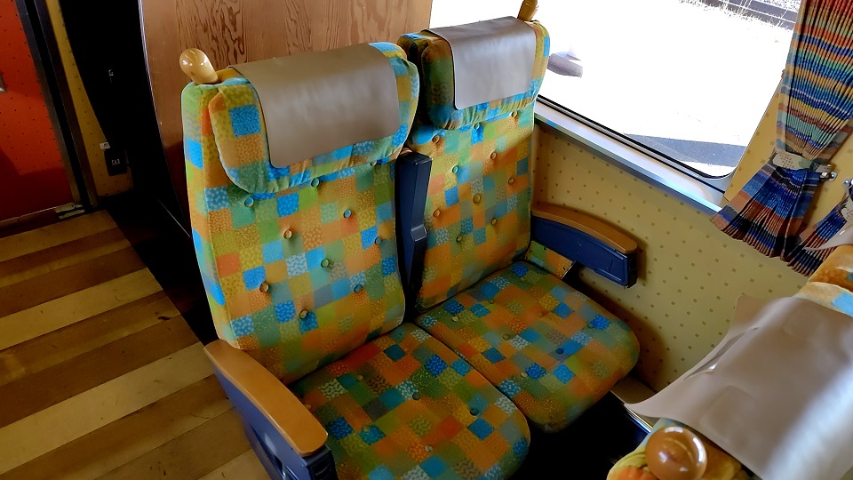 座席はピンク色の座面・背もたれに木製のひじ掛け・基礎の組合せです。適度なクッションの厚さと背もたれ部分の曲線により、座り心地は上々でした・