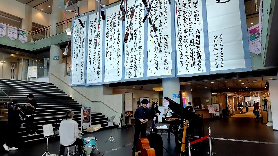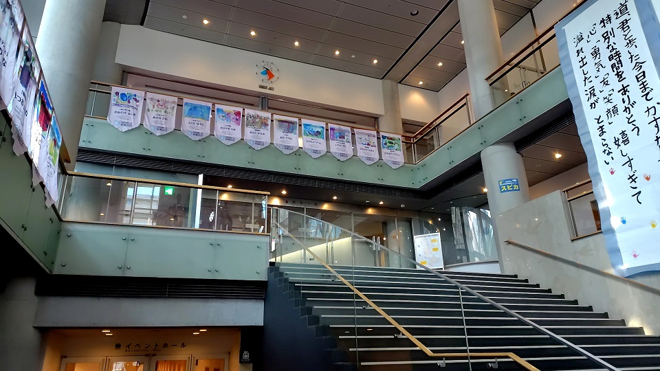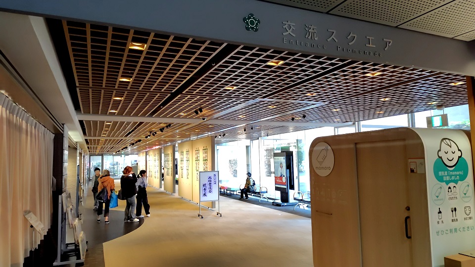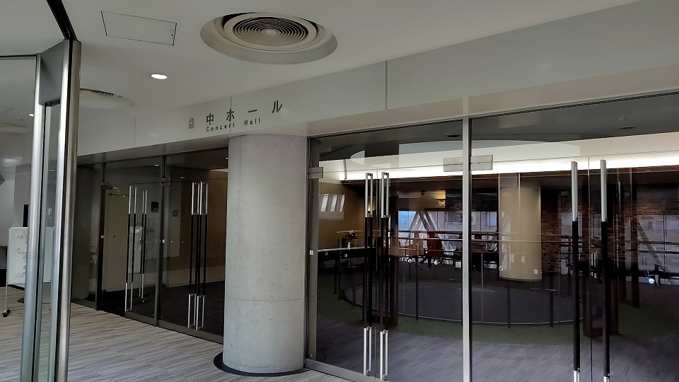 外の広場(アルカス広場)から建物に入ると、エントランスロビーがあります。それほど広いスペースではありませんが、各施設に向かう合流地点のような位置づけで、写真のようにミニコンサートが開かれることもあります。
