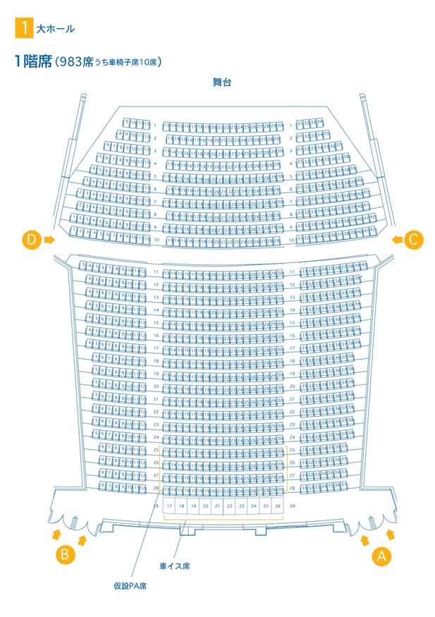 1階席の総客席数は983席で、1列から29列までで、途中10列と11列の間に中央通路が設置されています。