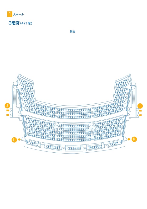 3階席の総客席数は471席で、1列から14列まであります。このうち、ステージ正面に正対するスタンド席部分の最前列は6列で、実質9列の構成になっており、途中8列と9列の間と、13列と14列の間に通路が設置されています。