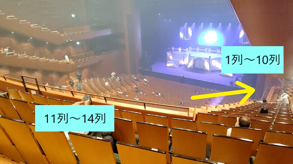3階席の総客席数は254席で、2階席と同じく1列から14列まであり、ステージに正対するスタンド部分は11列から14列までの4列分になります。