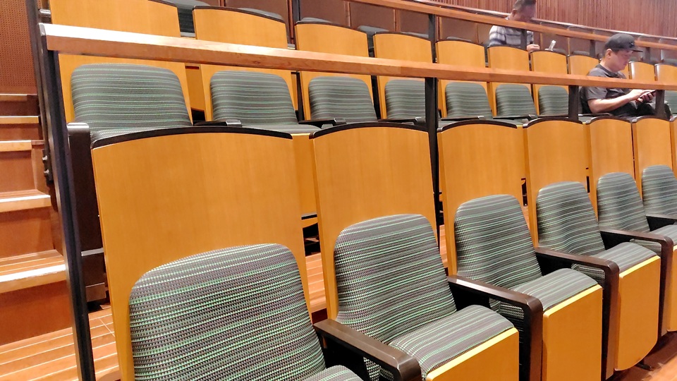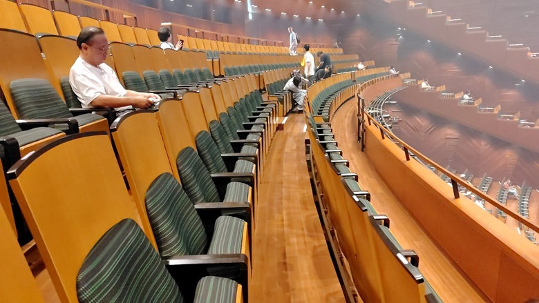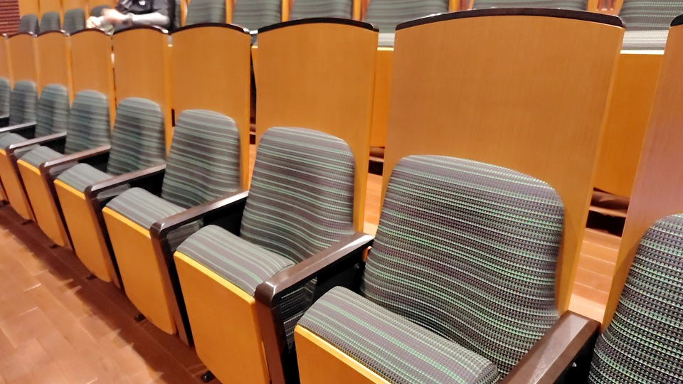 段差はオーケストラピット利用時の最前列となる7列の後ろから設置されており、中央通路を挟んで後方にかけては、より高低差が付けられています。