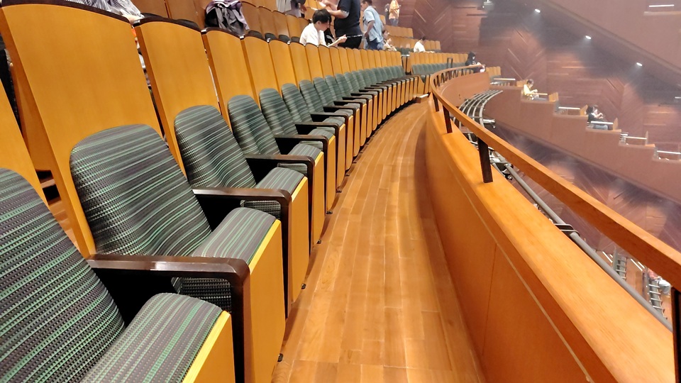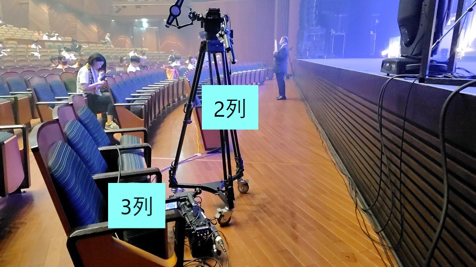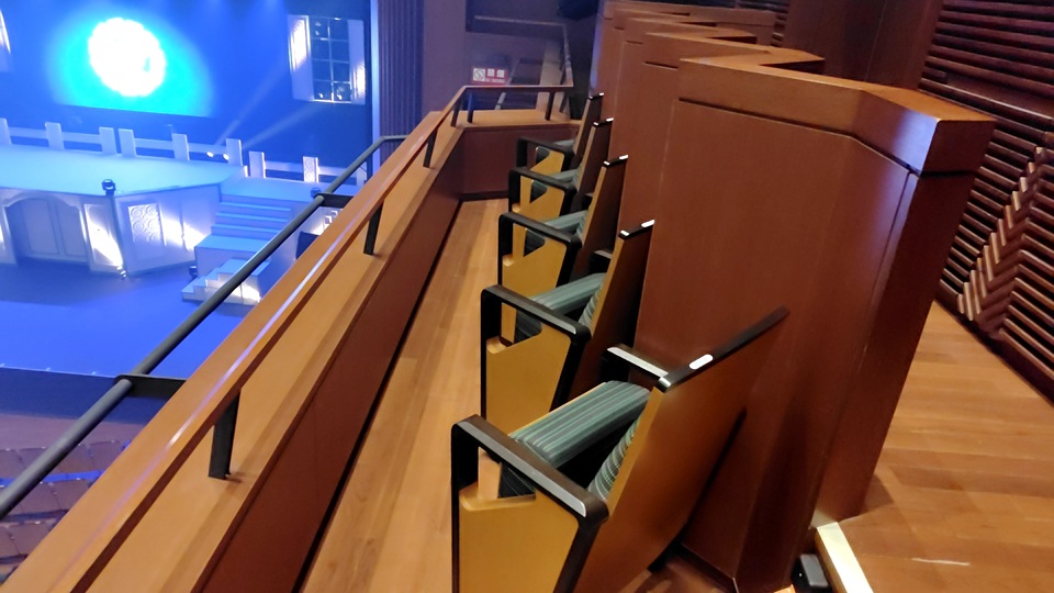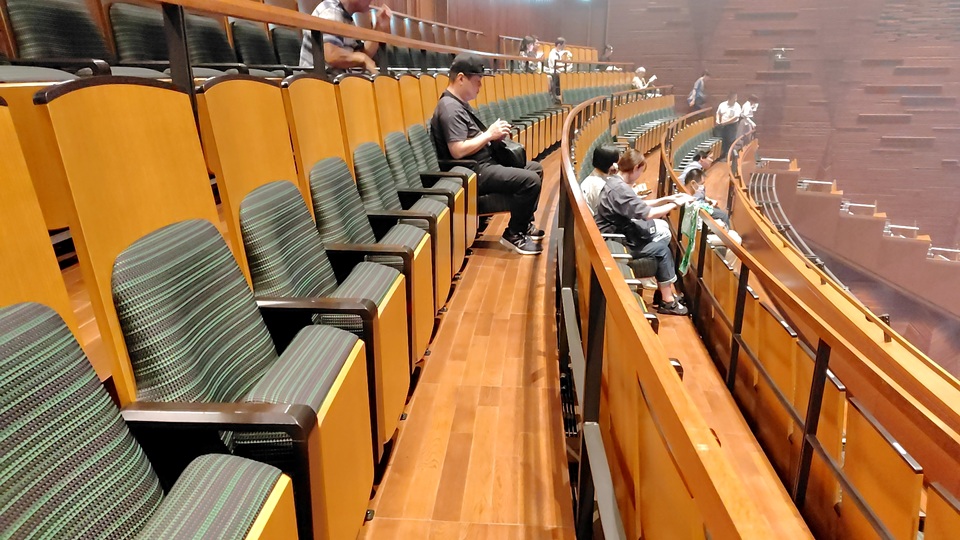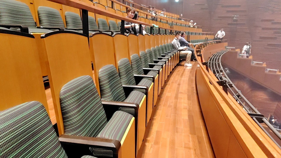 一方、1列から10列まではホールのサイドにせり出して設置されています。座席間の傾斜は2段分の段差が付けられ、階段状に一段ずつ下がっていくように配置されています。