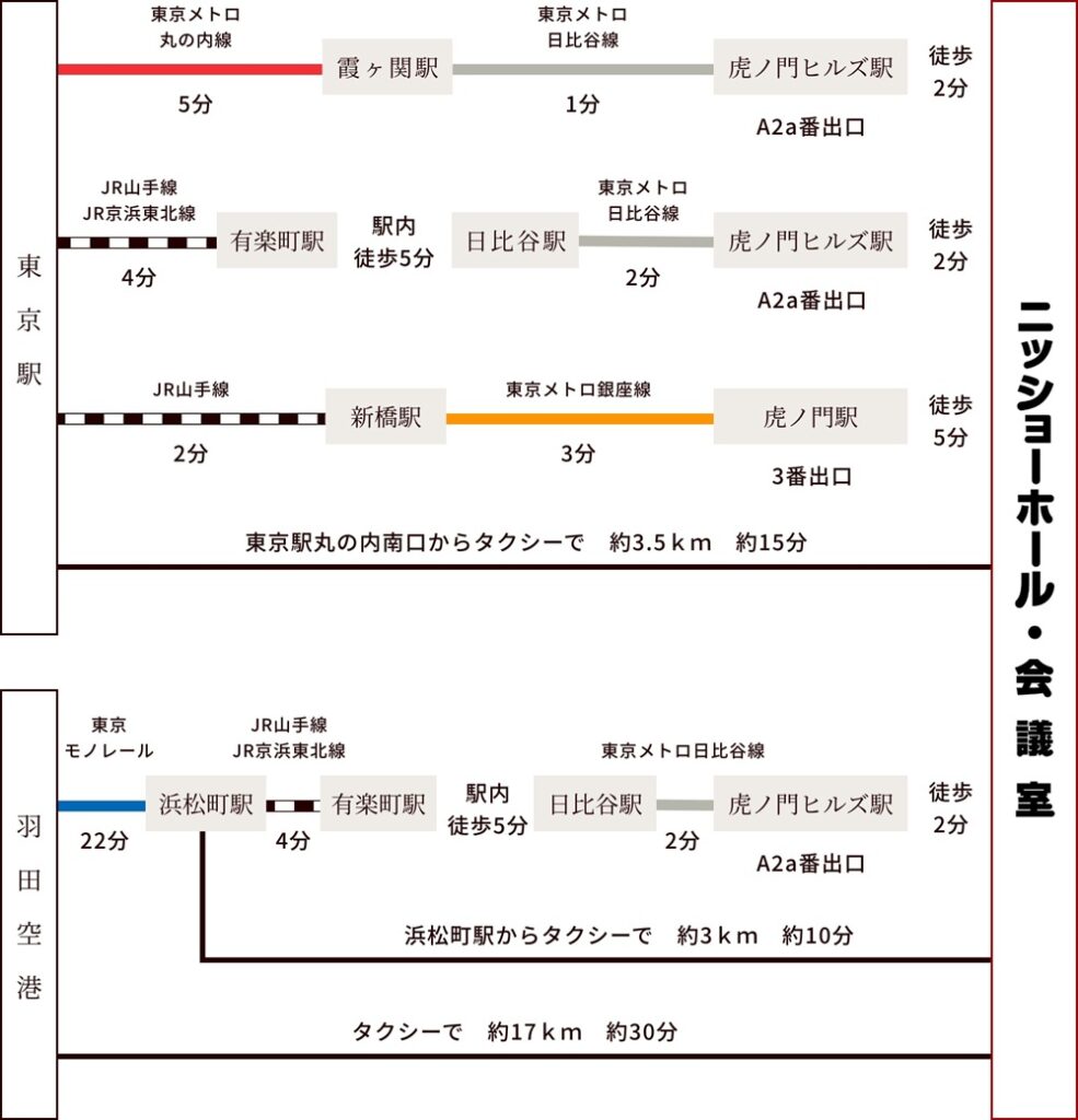 最寄り駅は東京メトロ日比谷線の虎ノ門ヒルズ駅または銀座線の虎ノ門駅。新幹線で東京駅まで来たら、公式サイトの案内に従い、丸ノ内線で霞ヶ関駅まで向かい、日比谷線に乗り換える方法と、JR山手線で隣りの有楽町駅に向かい、そこから歩いて東京メトロ日比谷駅に乗り継ぎ、虎ノ門ヒルズ駅を目指す方法が便利です。