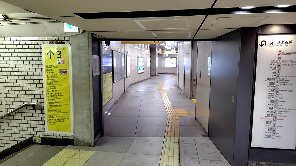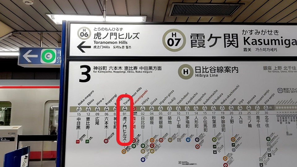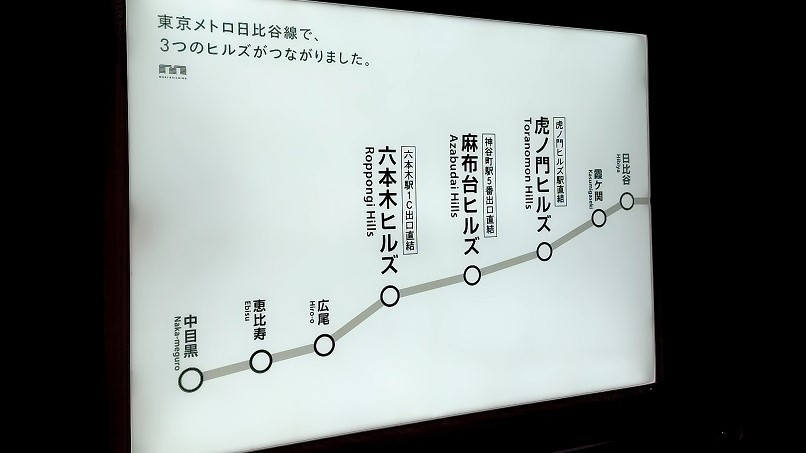 ちなみに今回の最寄り駅である虎ノ門ヒルズ駅を含め、隣りの神谷町駅前には麻布台ヒルズが、その隣りの六本木駅前には六本木ヒルズがあり、日比谷線内で3つのヒルズがつながっていることを示す案内看板も設置されています。