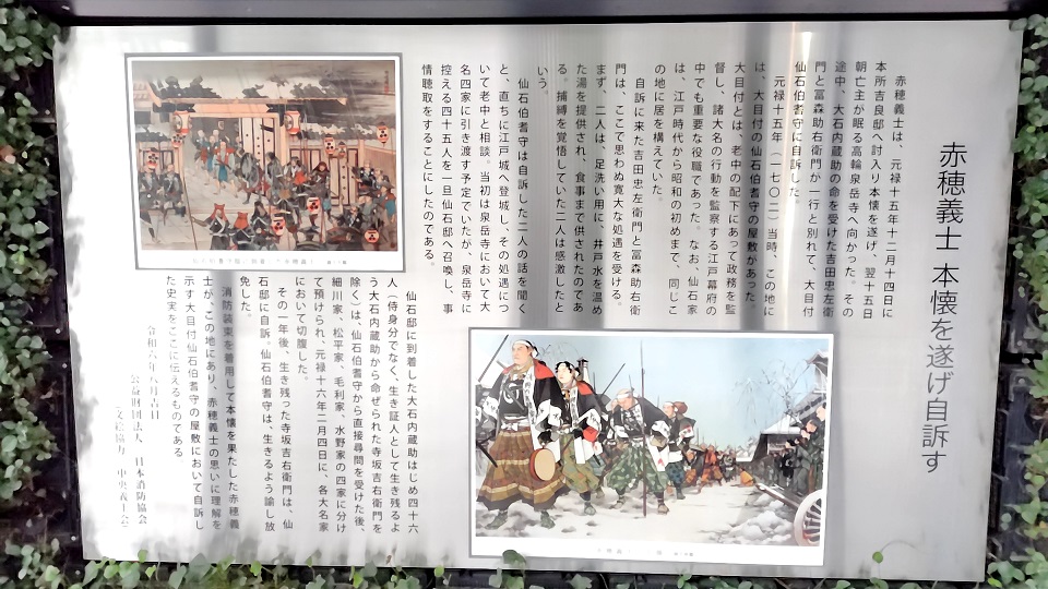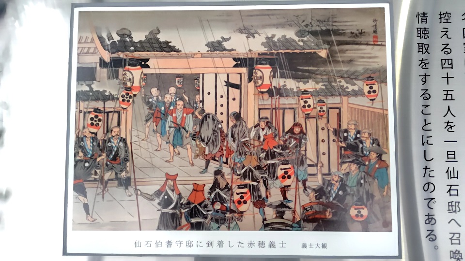 赤穂浪士が吉良邸に討入りを果たしたのち、泉岳寺に引き上げる途中で、一部の浪士がこの仙石伯耆守の屋敷に立ち寄り、自訴したと伝えられています。その後に浪士を集め聞き取りを行う場面が、歌舞伎の演目のシーンでも取り扱われています。
