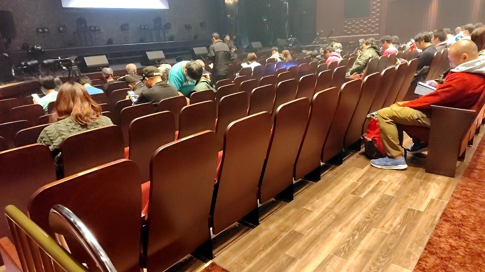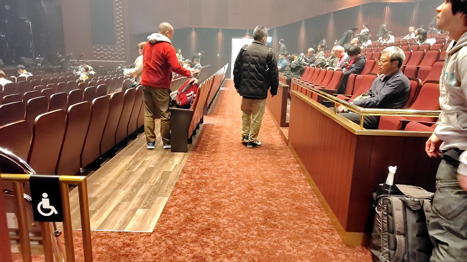 座席間の傾斜は通路前後にかかわらず同じで、1階席後方よりも角度が付く形で、段差2段分の傾斜が付けられています。