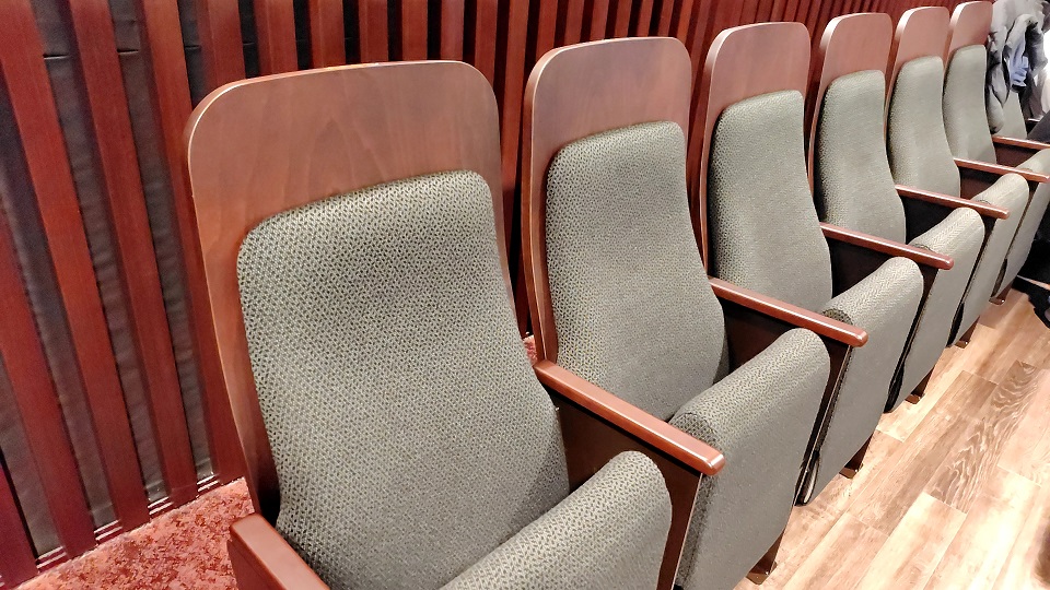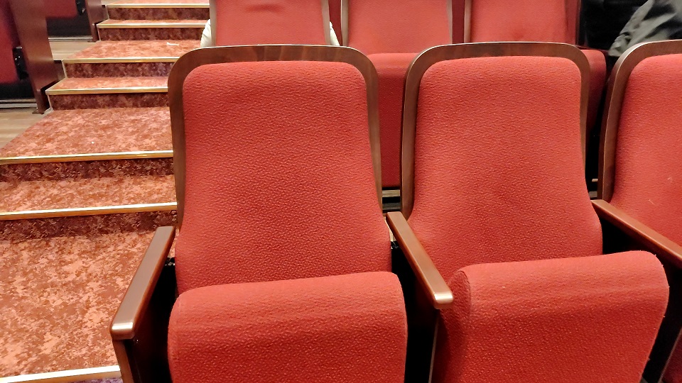 座席は1階席とバルコニー席が赤い座面・背もたれ、2階席が薄緑色の座面・背もたれのハイバックタイプで、それぞれ木製のひじ掛けと基礎との組み合わせです。座面のクッションは最近多くみられる比較的薄めで、少し硬めの疲れにくいタイプのものです。