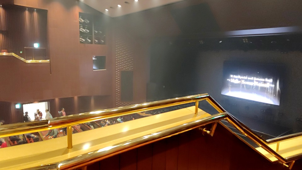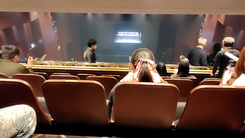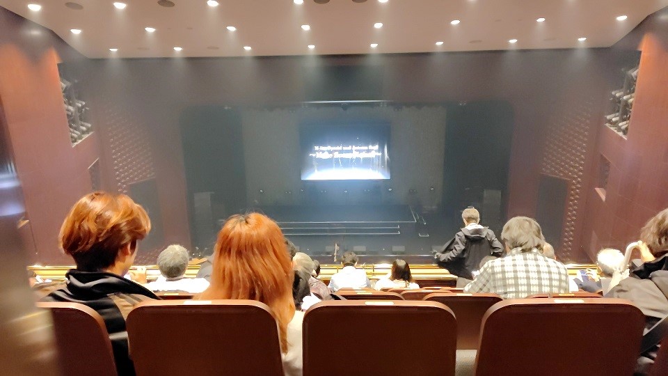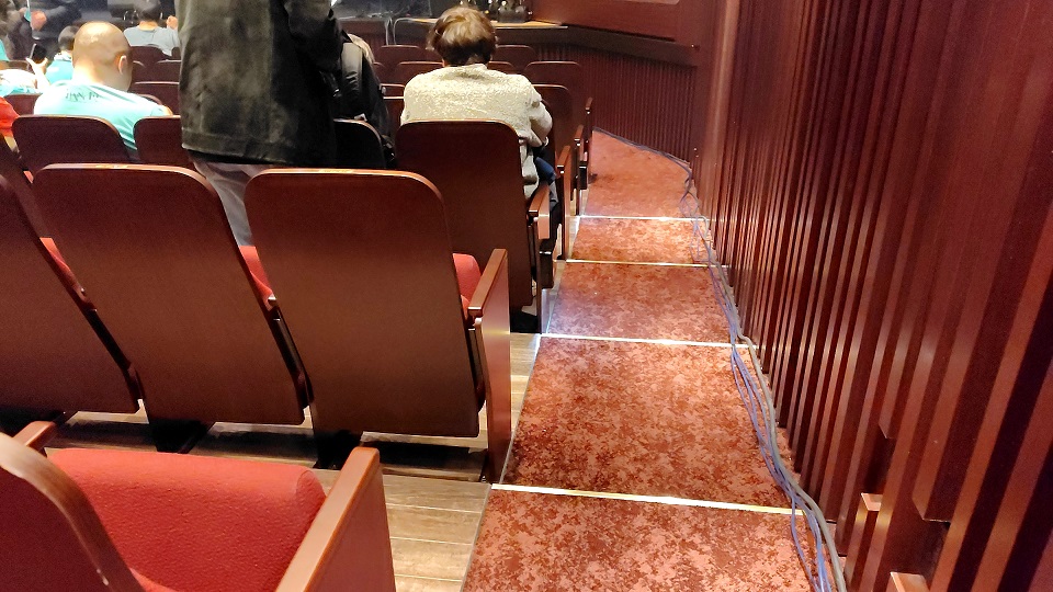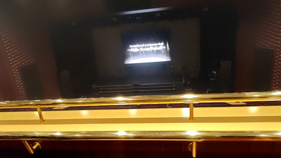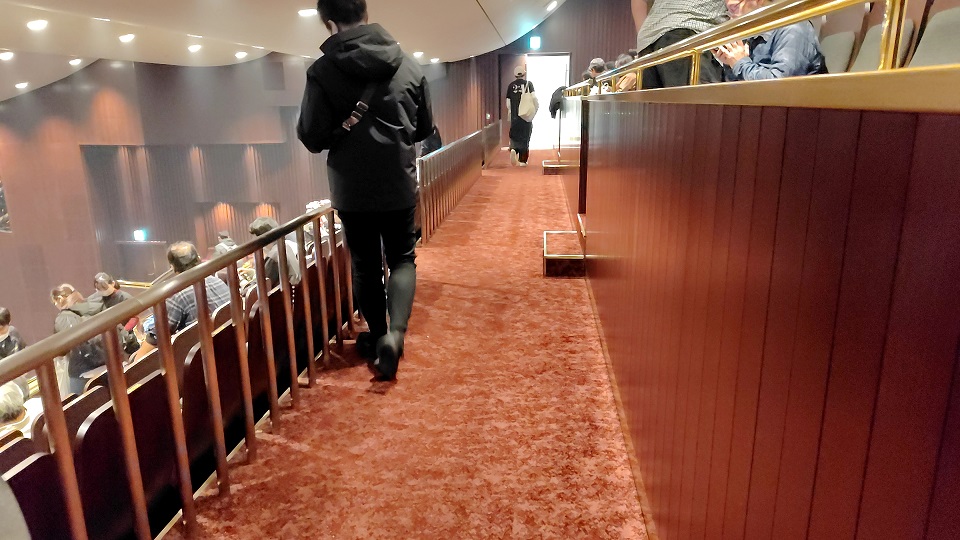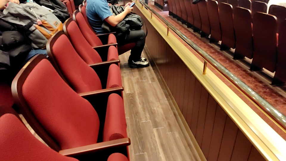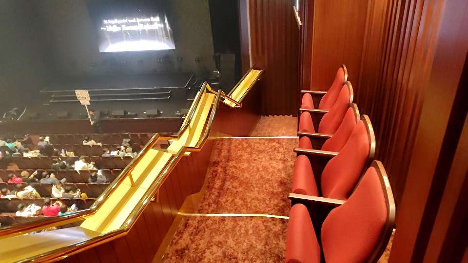 横から見るアングルになるのと、手前の壁や手すりがステージにかかり死角が生じることは否めず、あまり見晴らしのいい席ではありません。