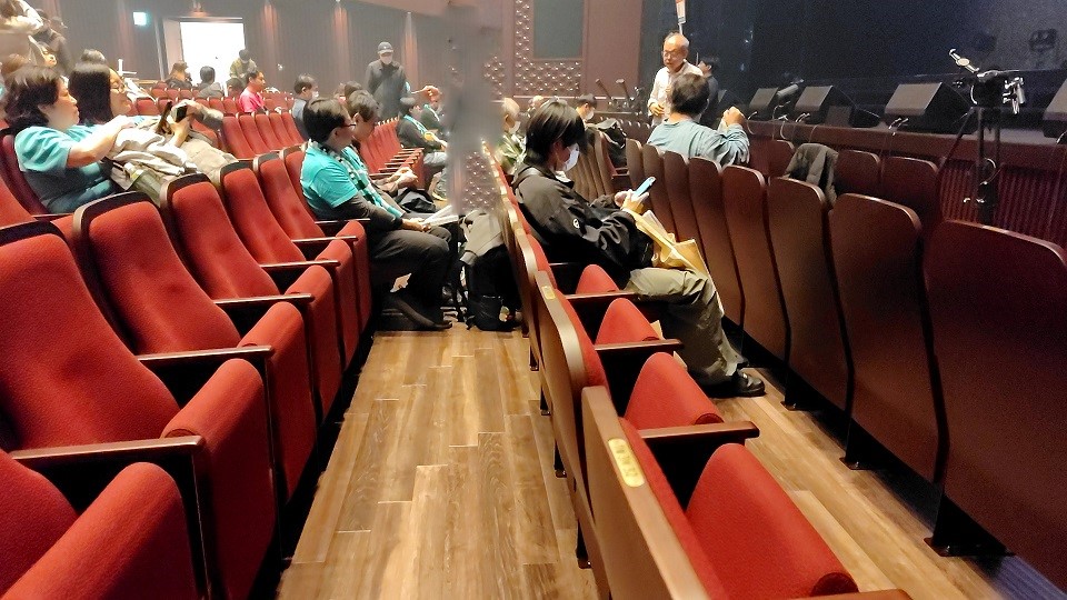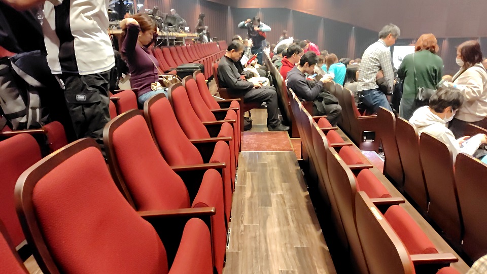 ひじ掛けの幅(3.5cm)で少しわかるかもしれませんが、コンパクトに1,000席を収める仕様のためか、若干座面の幅(42.5cm)や前後の間隔は狭くなっています。