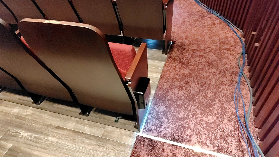 通路前方の座席の傾斜は緩やかで、4列まではフラット、5列から段差(1段分)が付けられています。