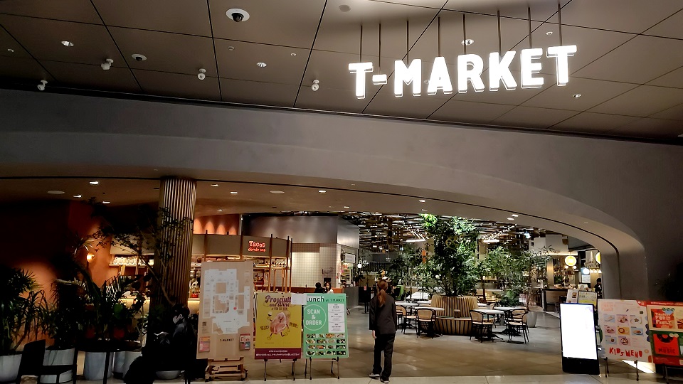 ステーションタワーの地下2階「ステーションアトリウム」の先には「T-MARKET(ティーマーケット)」があり、カフェやダイニング、バー・ラウンジなどの飲食店やスイーツ、チーズ&ワイン、雑貨などのショップの全27店舗が集積しています。