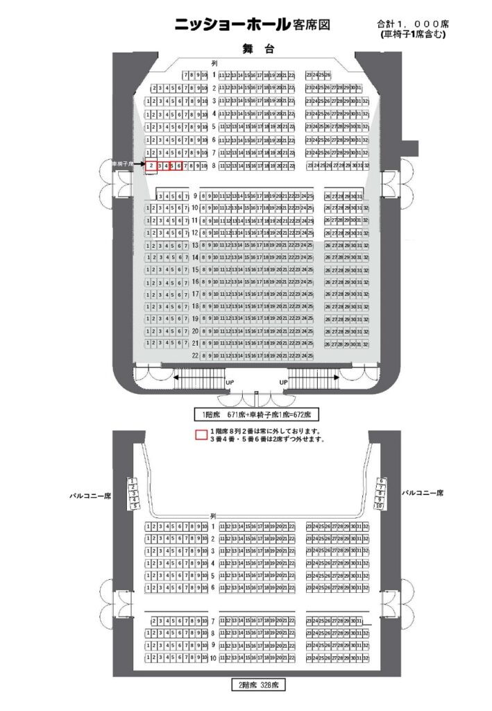 2階席の総客席数は328席で、1列から10列まであります。途中、6列と7列の間に中央通路が設置されています。