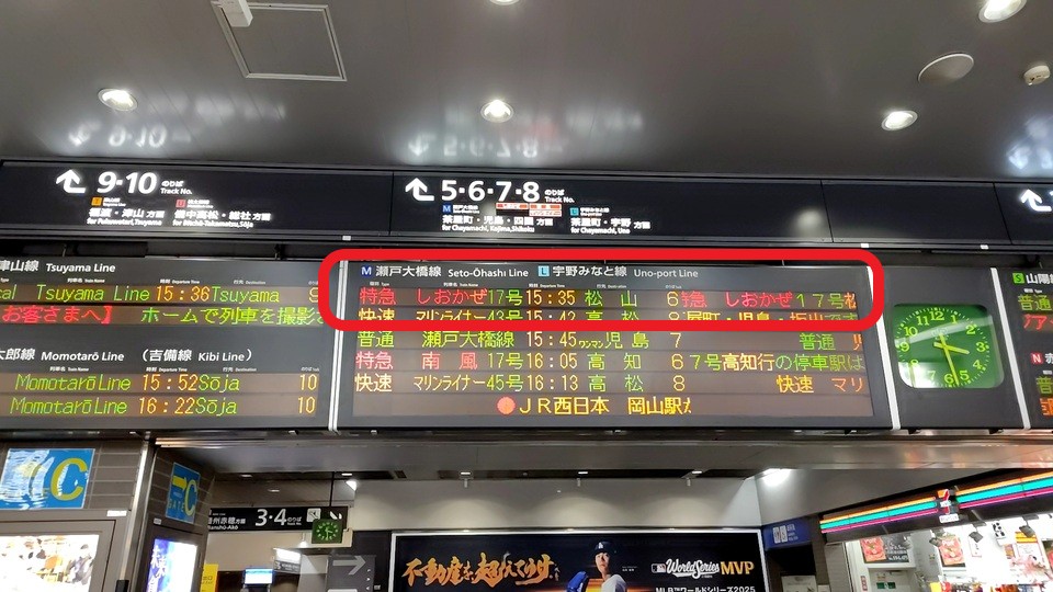 5・6・8番線は特急しおかぜ号や快速マリンライナーなど、四国方面に向かう特急列車の出発ホームになっています。