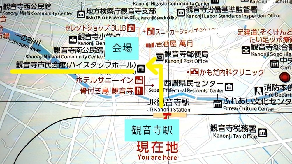観音寺駅から会場までのアクセスルートはいたってシンプル。駅の改札を出て前の道を北上するだけでOKです。所要時間は徒歩約3分です。