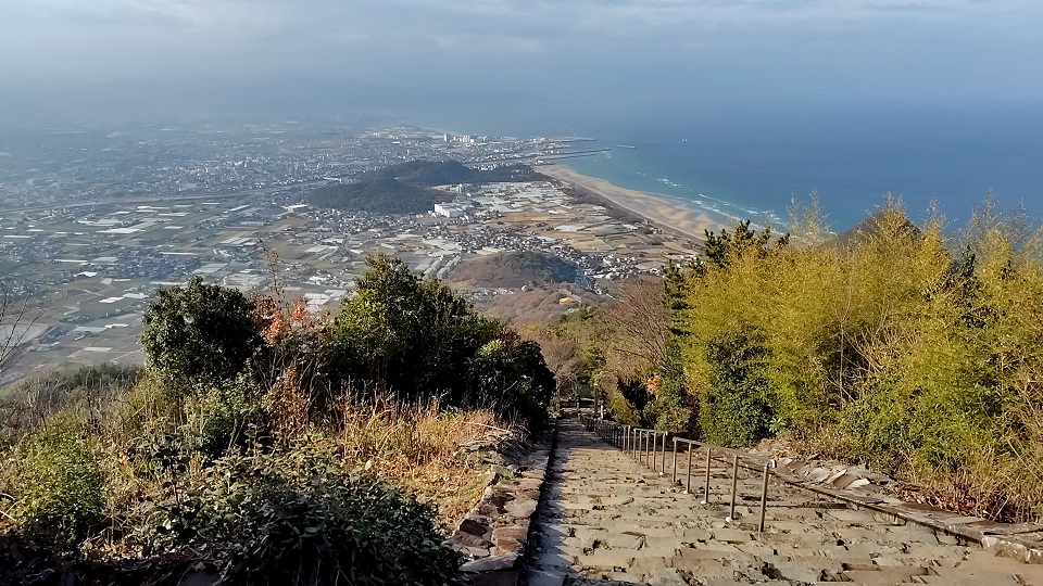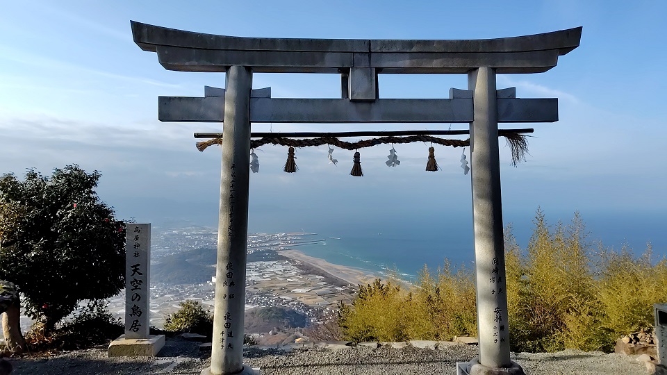 高屋神社は、観音寺市内にある標高約400mの稲積(いなづみ)山の頂上にその本宮がある神社です。特徴は何といっても、本宮から観音寺市街地と雄大な瀬戸内海が一望でき、鳥居越しの絶景は「天空の鳥居」として、四国八十八景の選出されているほどです。