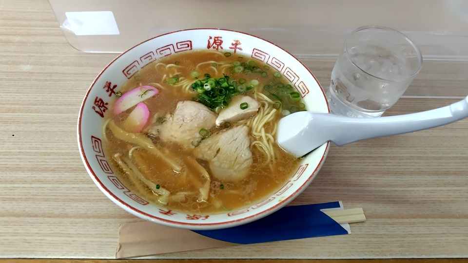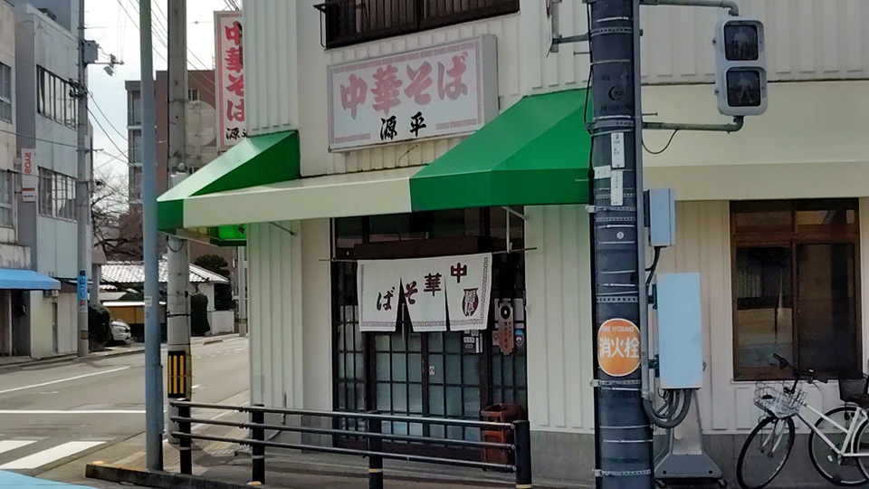 「中華そば 源平」は、会場の西側の通りをもう一本隔てた「観音寺市三架橋」交差点の角にある、町中華の地元人気店です。駅からも近く、小ぢんまりとした店ですが、レンタカーで訪れても、お店周辺に駐車場が複数確保されています。