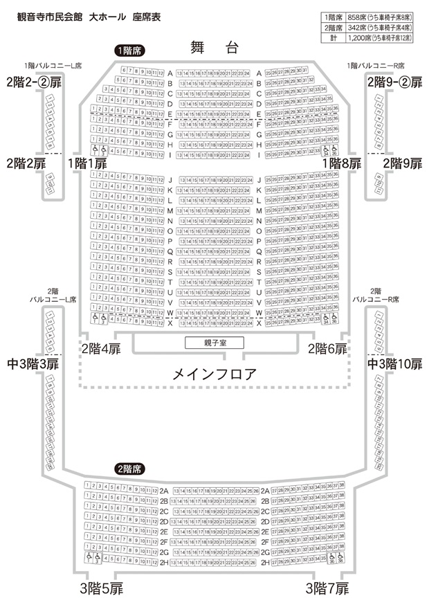 1階席の総客席数は858席で、メイン部分の客席はA列からX列までの24列あり、途中、I列(9列目)とJ列(10列目)の間に中央通路があります。