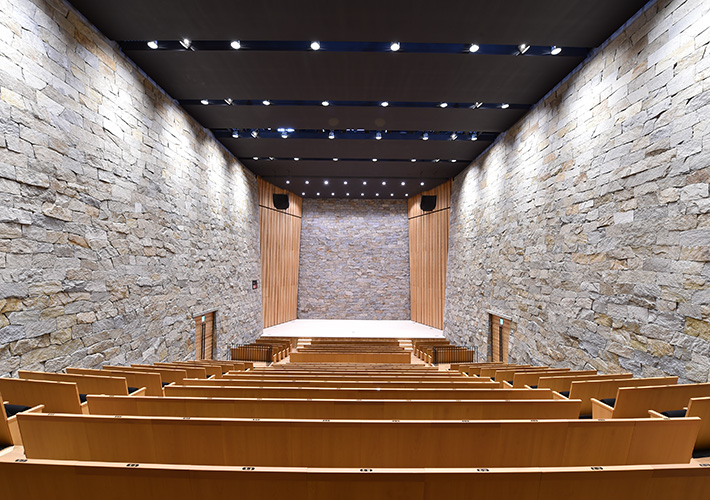 ホールの特徴として、側壁に地元香川県産の庵治石(あじいし)を採用した国内のみならず海外でも珍しい石積み壁のホールで、クラシックのリサイタルやアンサンブルの演奏会等での演奏に適した音響設計になっています。