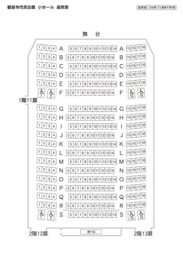 小ホールの総客席数は334席で、ワンスロープの構造です。座席はA列からS列までの19列あり、途中F列(6列目)とG列(7列目)の間に中央通路が設置されています。通路前方に比べ、通路後方の傾斜は強めになっています。