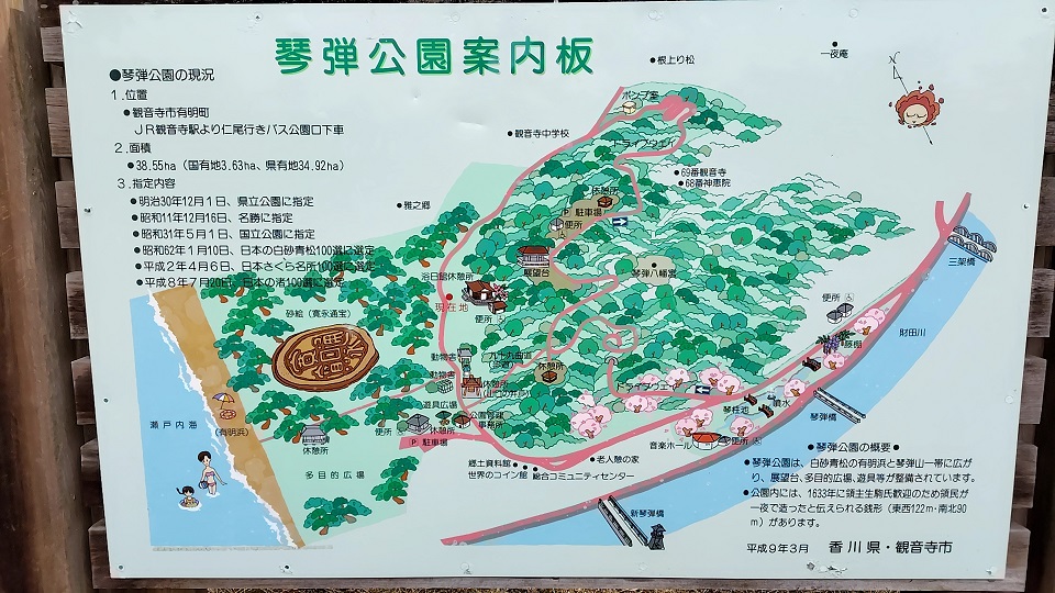 琴弾(ことひき)公園は、瀬戸内海を臨む有明浜に面した、約48haの広さを誇る瀬戸内海国立公園にも含まれる名勝で、中核をなす琴弾山(ことひきやま)の山頂や山麓には、名所旧跡が点在しています。