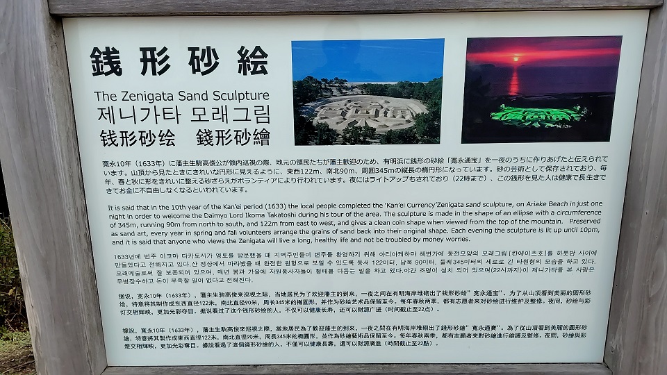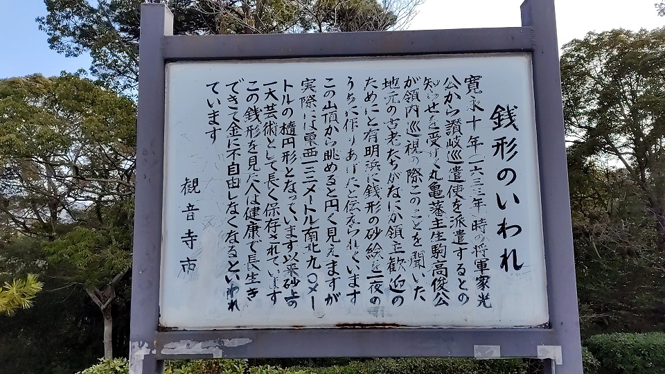 冒頭で紹介した「寛永通宝」を模した銭形で、1633(寛永10)年、藩主の生駒高俊公が領地を巡視に来た際、地元の領民が一夜で寛永通宝の砂絵を作り上げたエピソードがその由来となっています。