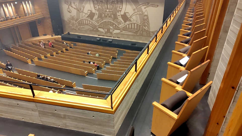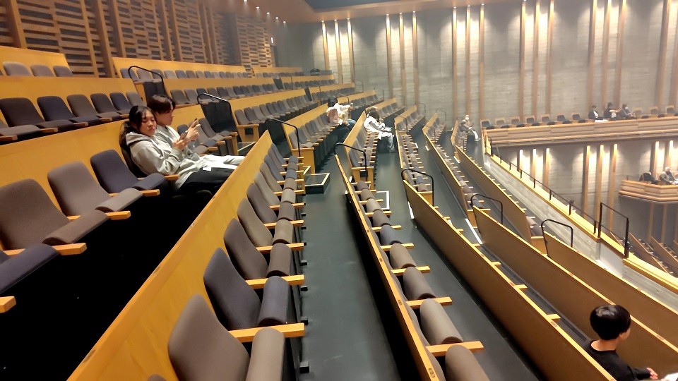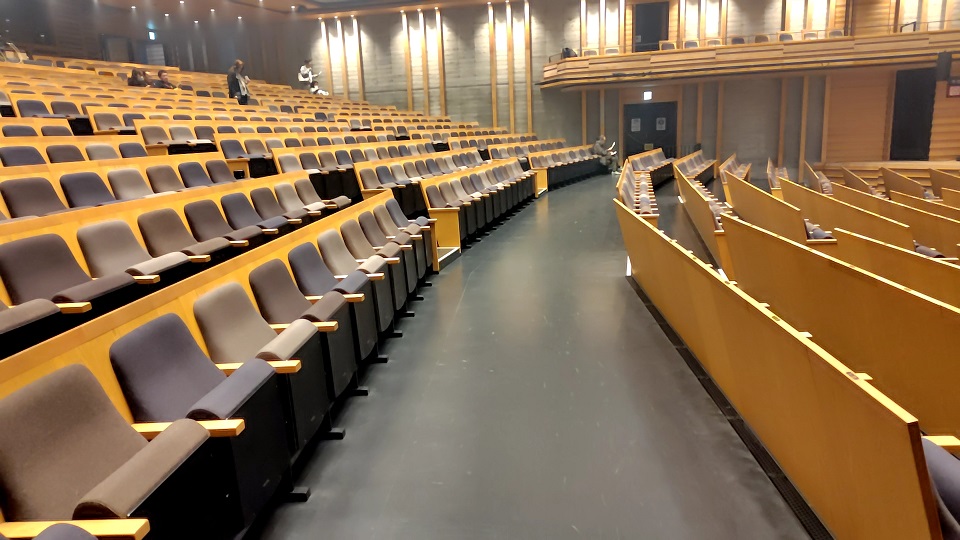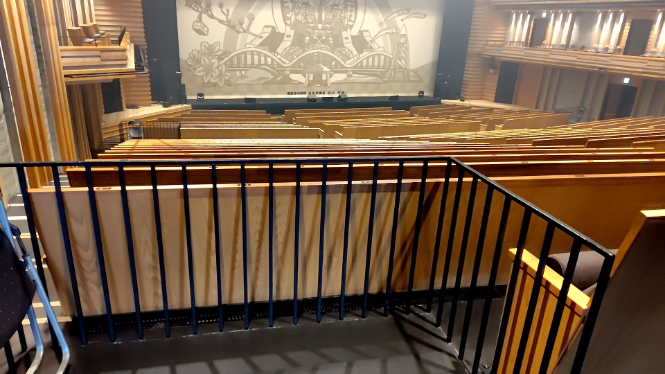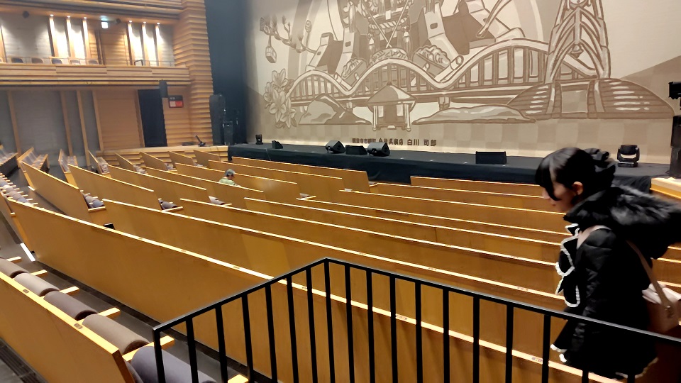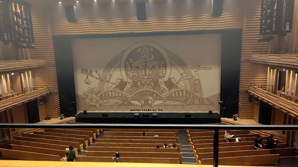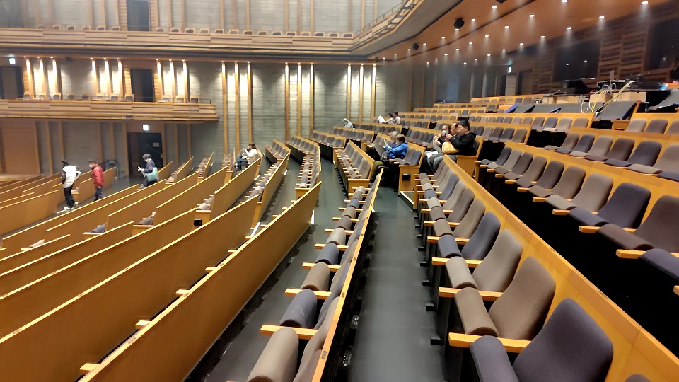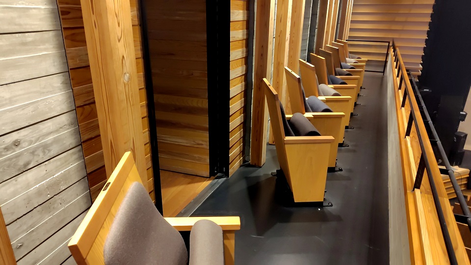 座席や壁面に木材がふんだんに使われており、木の香りとぬくもりが感じられるホールで、座席の前後は千鳥配置になっており、前の人の頭で視界が遮られにくい工夫が施されています。