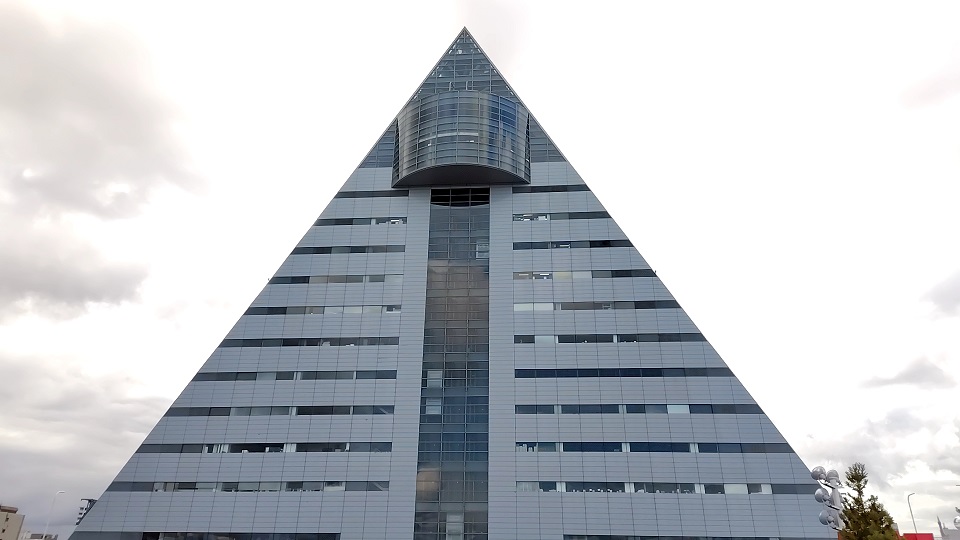 青森駅前から海岸沿いを歩いて行った先の青い海公園付近には、「青森県観光物産館 アスパム」があります。名前のとおり、買い物、グルメ、エンタメの複合施設で、三角形の外観が特徴です。