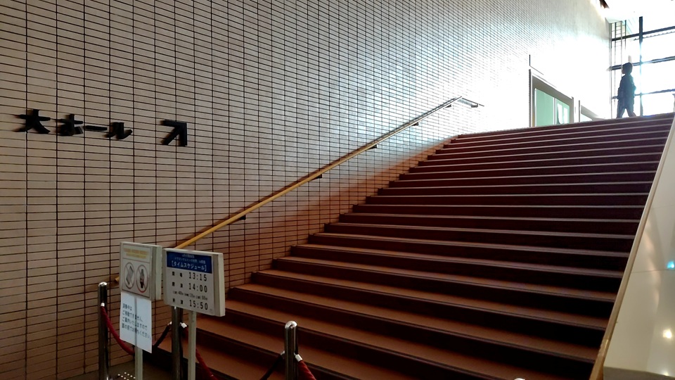 大ホールのエントランスは、階段を上がった建物2階にあります。