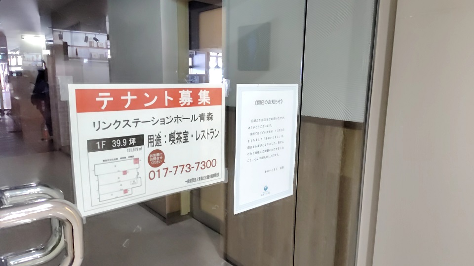 正面玄関の左側には、レストラン「あおいとまと」がありましたが、残念ながら2023年末で閉店しており、テナント募集の紙が貼られていました。