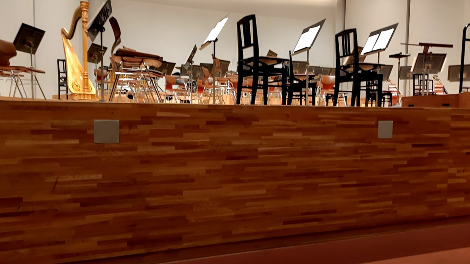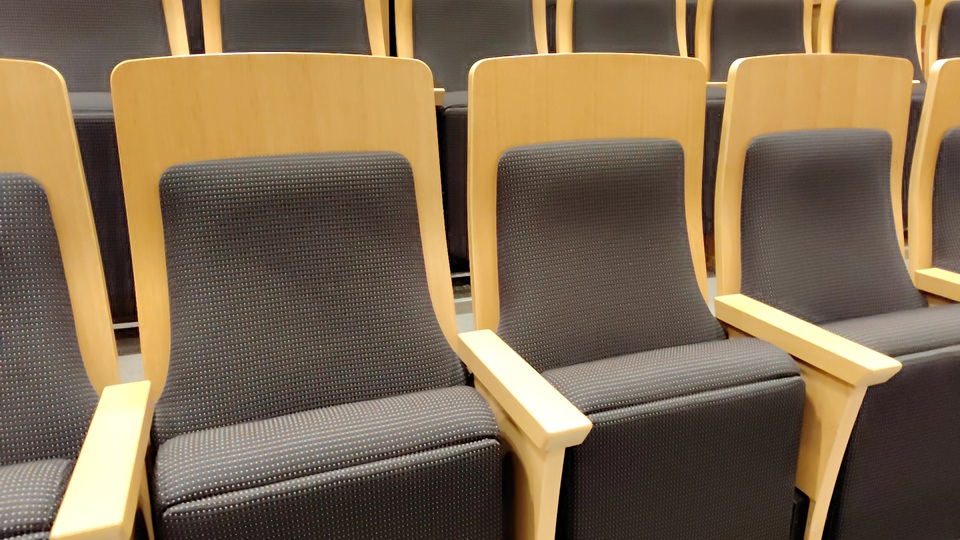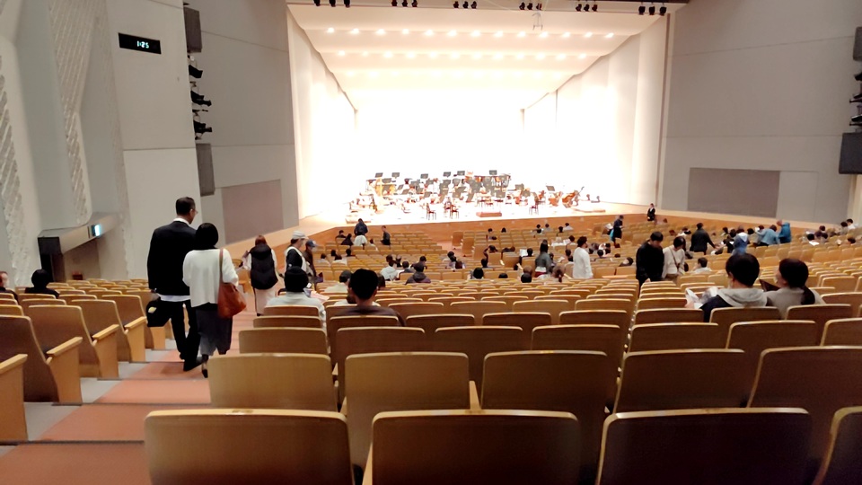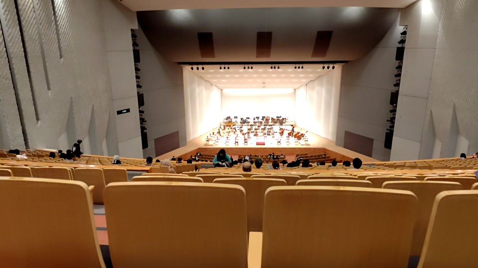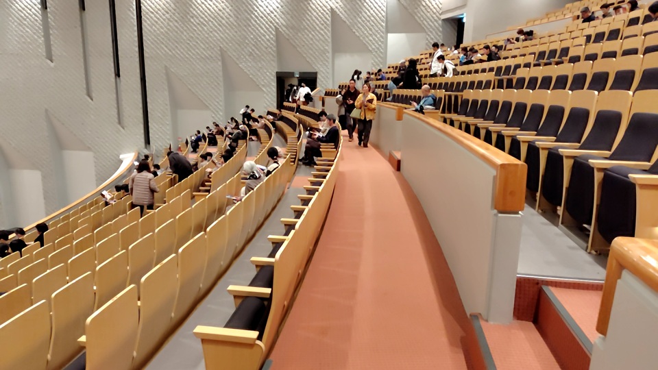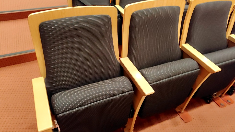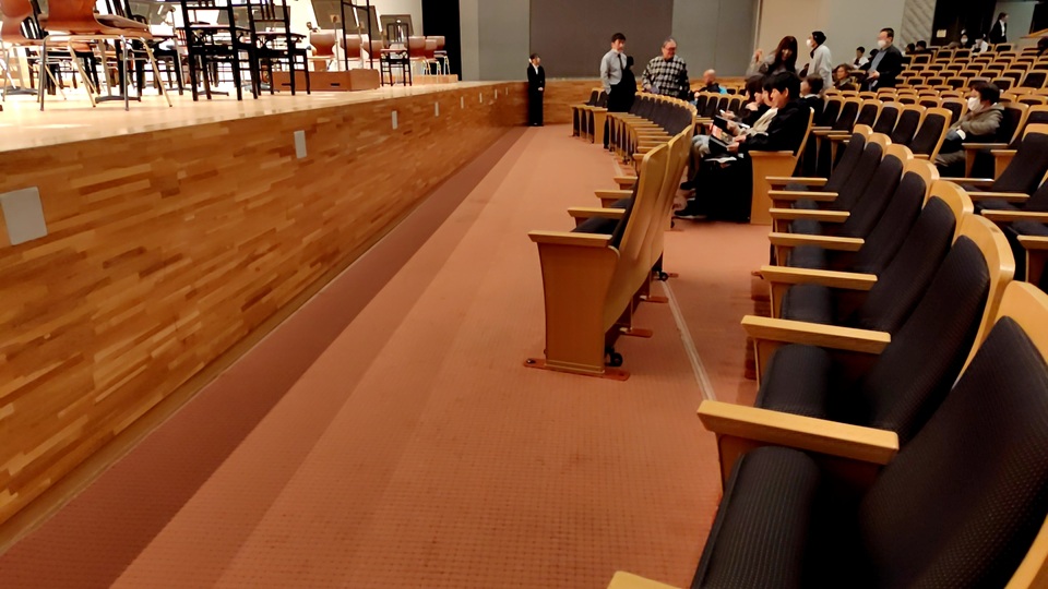 大ホールの座席は濃茶の座面・背もたれと木製のひじ掛け・基礎の組合せです。座面のクッションは適度な厚みが確保され、座り心地は上々でした。階上席の背もたれは階下席に比べ、ハイバック仕様になっています。