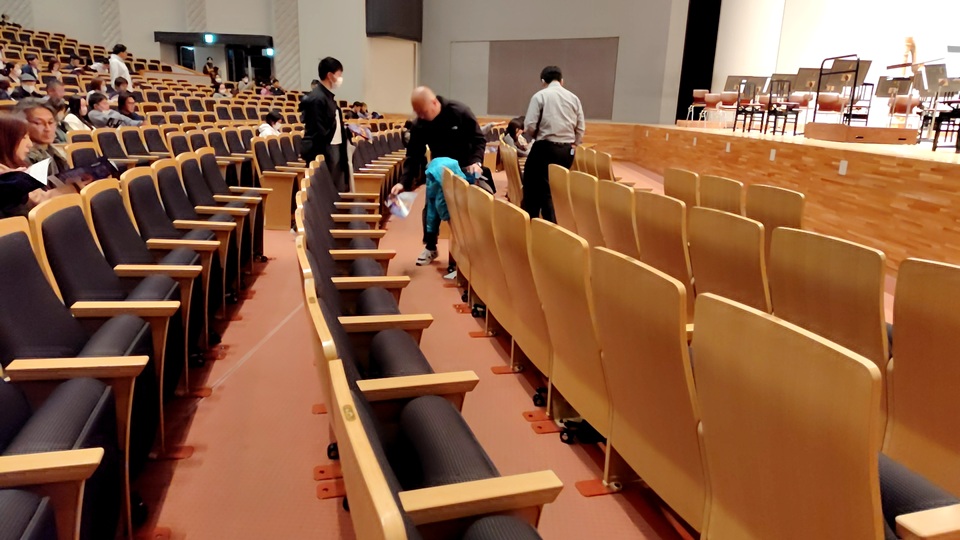 通路前方はき列(7列目)まではフラットで、く列(8列目)から段差による傾斜がつきます。オーケストラピット設置時は、お列までの5列分の座席が撤去されます。