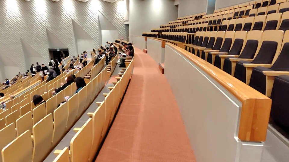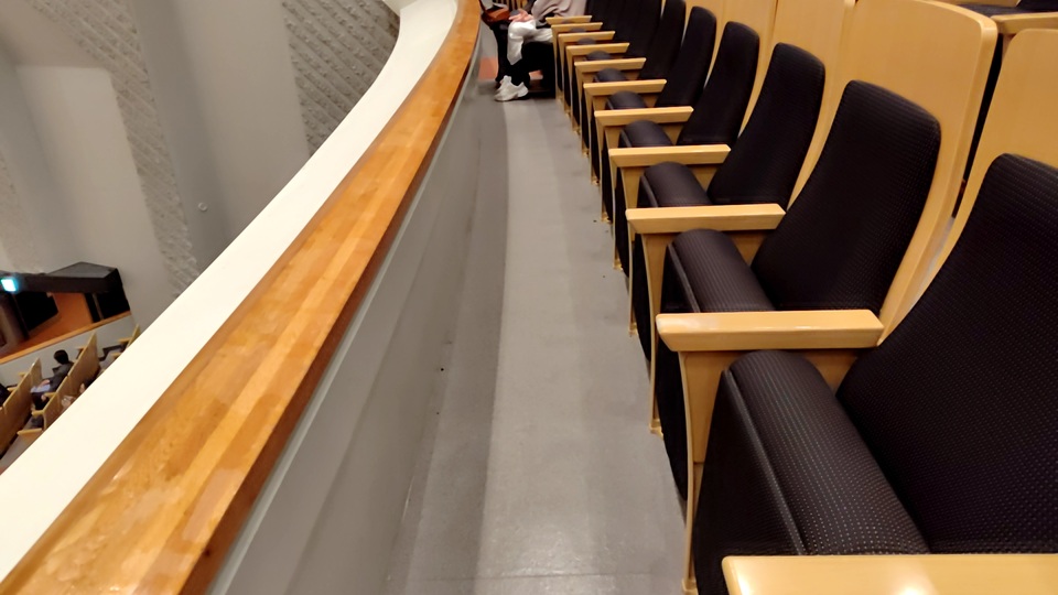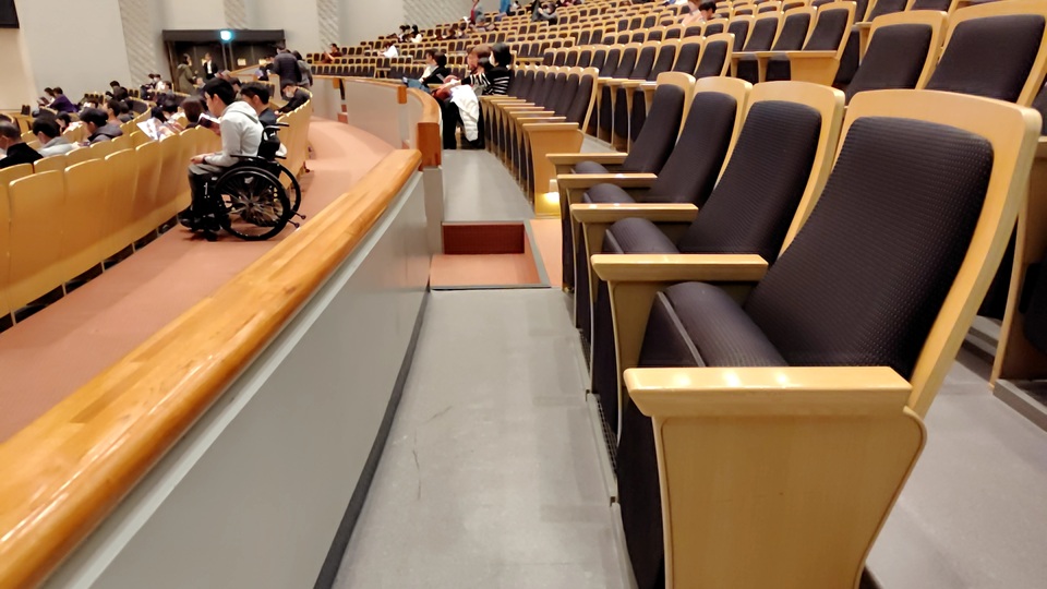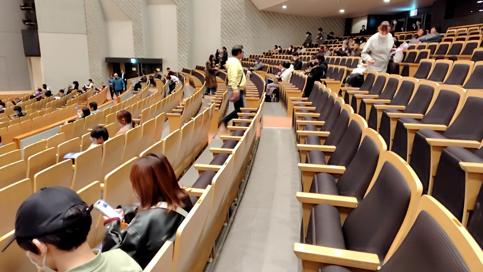 座席間の傾斜は、階下席後方と同じくらいの段差が付けられ、全体的にやや強めになっています。